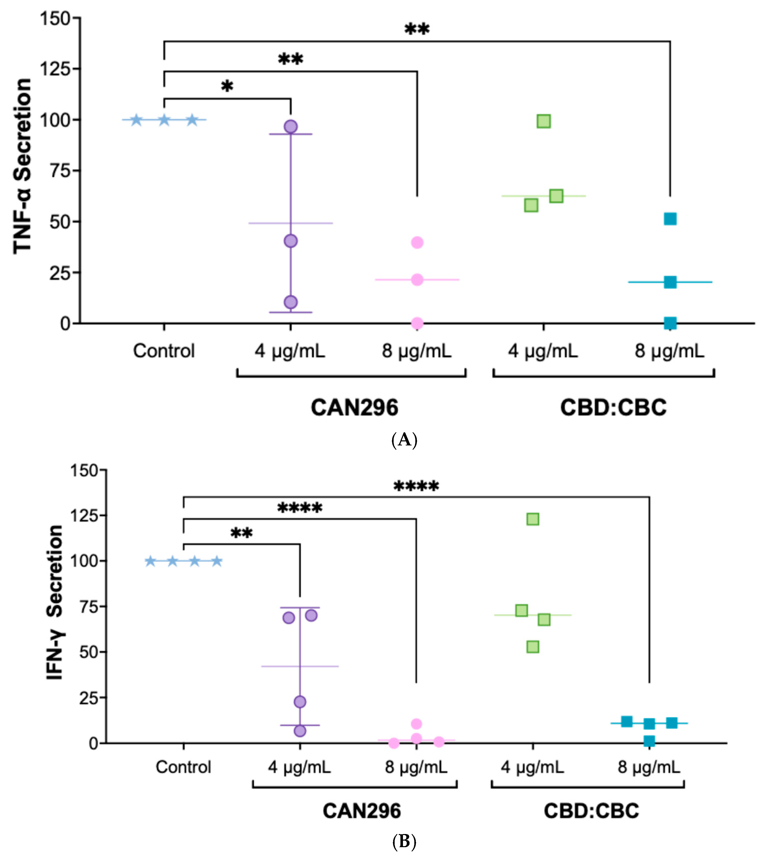 2.1. CAN296 and CBD:CBC (2:1) Combination Significantly Inhibited TNF-α and IFN-γ Secretion by CD8+ T Cells