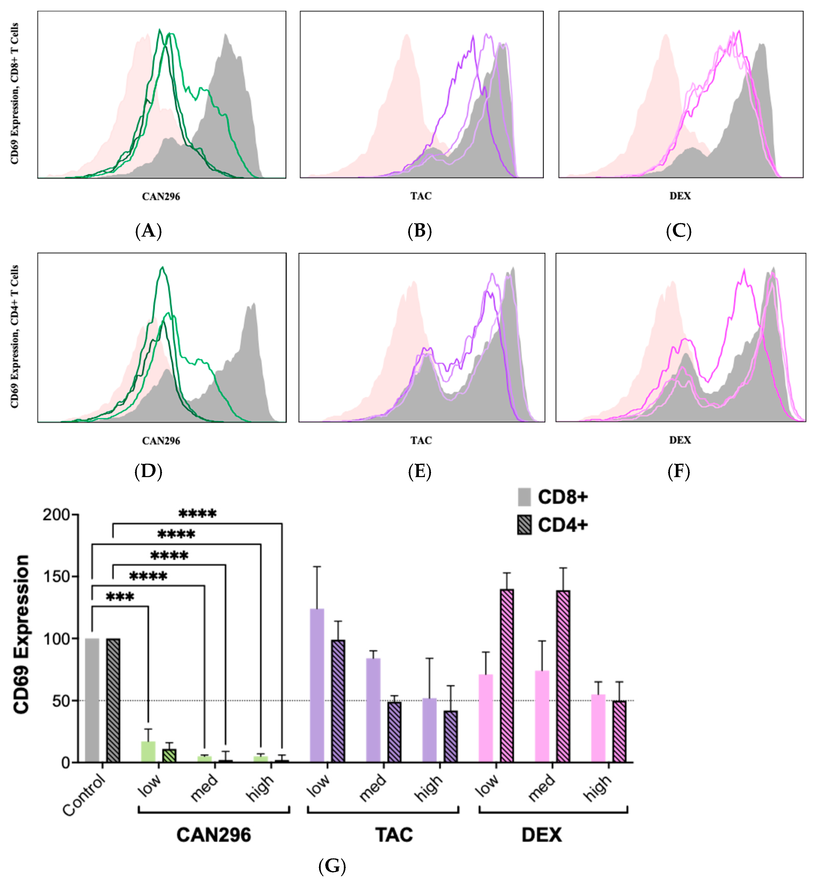 2.2. CAN296 Suppresses CD69 Expression on CD4+ and CD8+ T Cells, Outperforms Dexamethasone and Tacrolimus