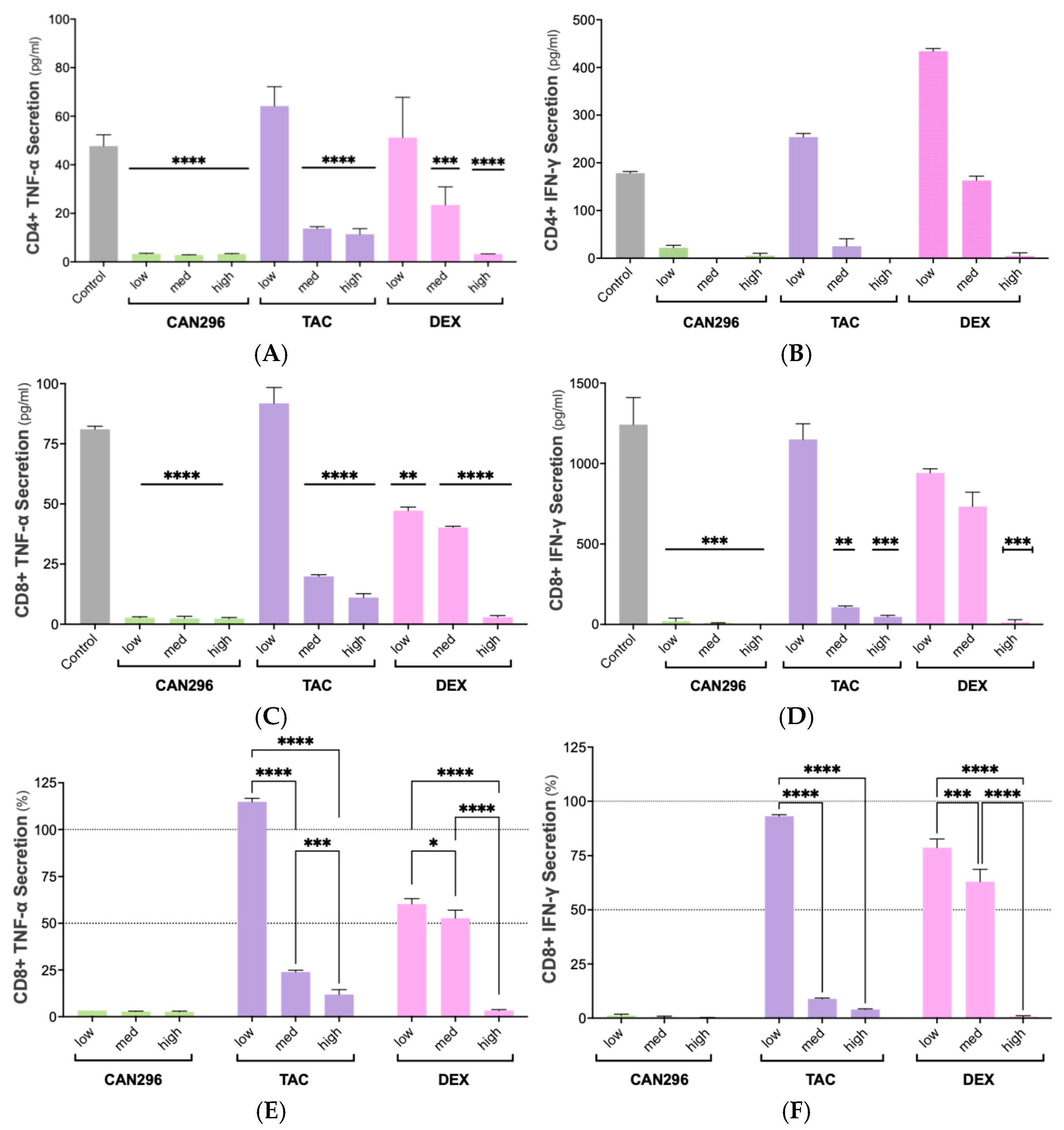 2.3. CAN296 Inhibits TNF-α and IFN-γ Secretion by CD4+ and CD8+ T Cells, Outperforming Dexamethasone and Tacrolimus