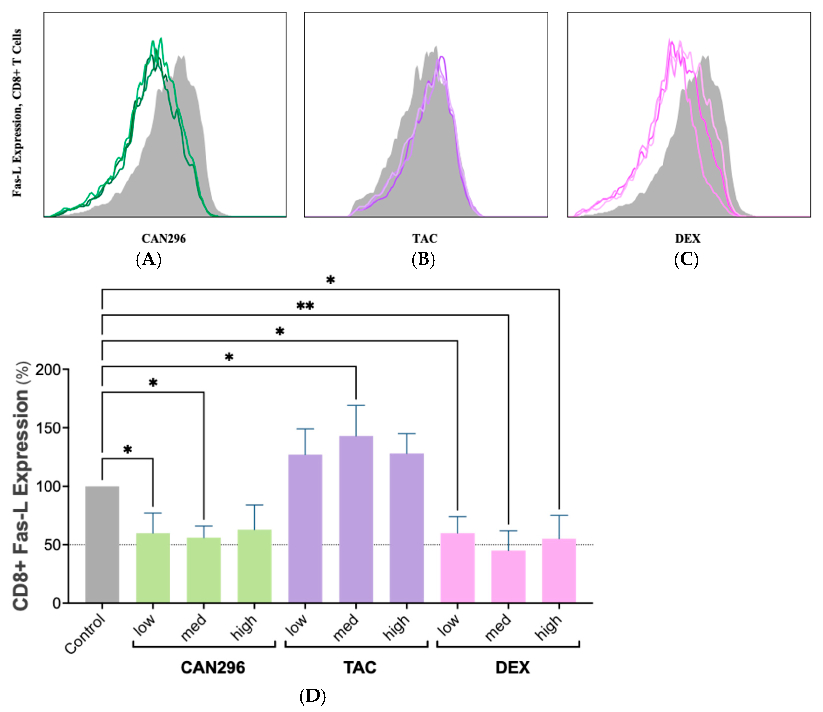 2.4. CAN296 Reduces Fas-L Expression in CD8+ T Cells, Outperforming Dexamethasone and Tacrolimus