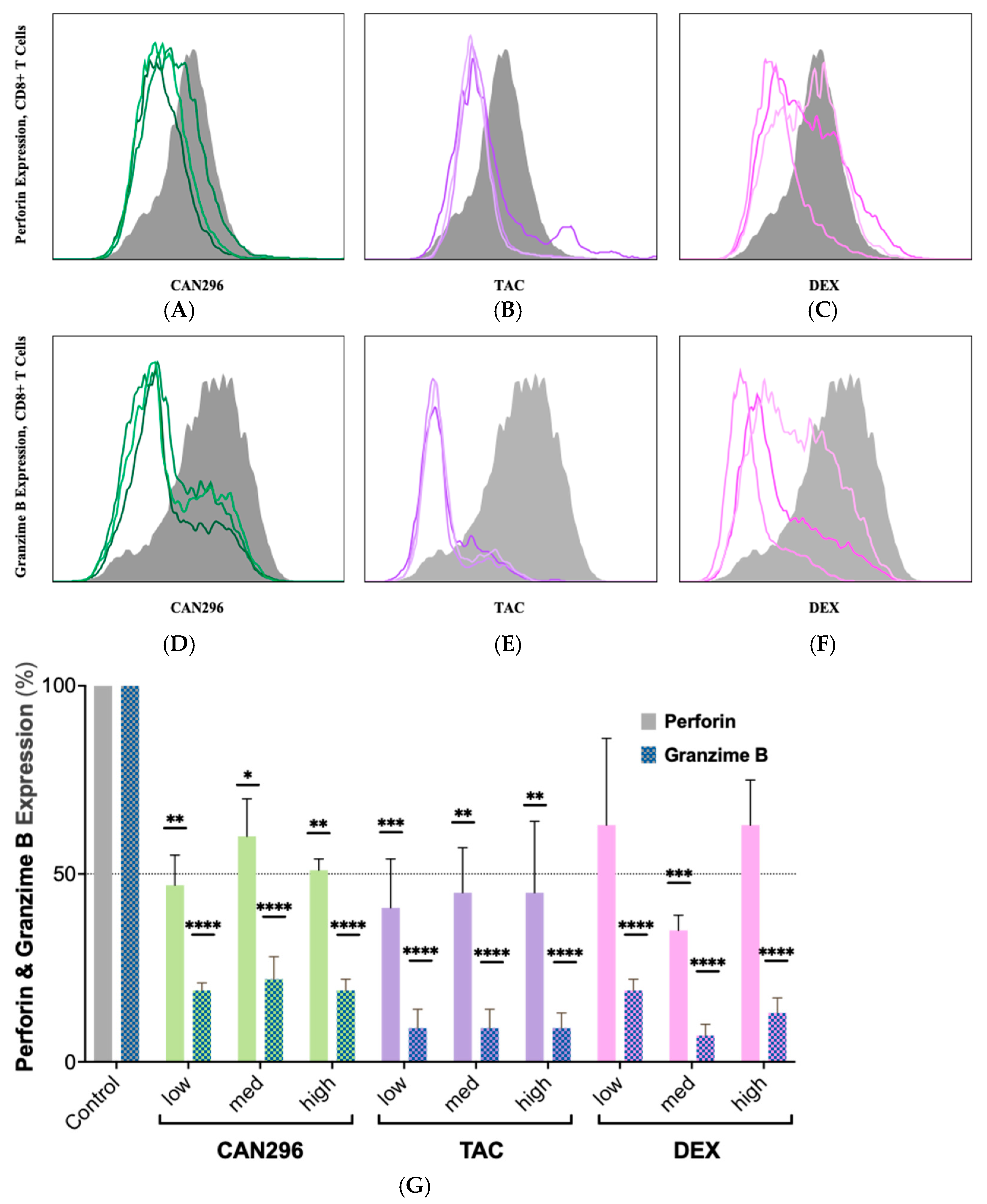 2.5. CAN296 Inhibits Granzyme B and Perforin Expression in CD8+ T Cells, Comparable to Dexamethasone and Tacrolimus