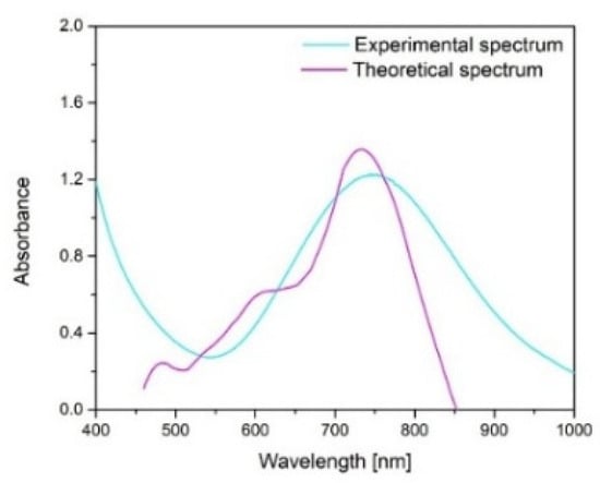 Based on the theoretical spectrum generated using MiePlot, the calculated diameter of CuNPs was approximately 30 nm, which is relatively similar to the 37.5 nm size measured by SEM. This highlights that the Mie theory provides a useful preliminary tool for determining the size of spherical or quasi-spherical CuNPs, while the broader full width at half maximum of the experimental spectrum and lower absorbance suggests a lower concentration and some polydispersity compared to the ideal monodisperse theoretical case.