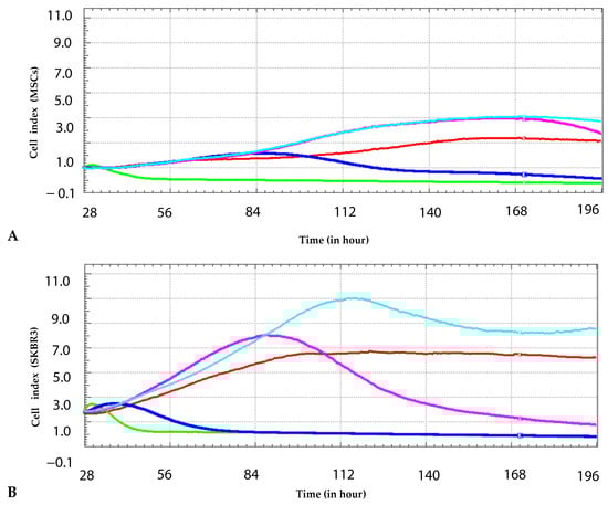 The impact of CuNPs was investigated on both normal MSCs and the SKBR3 breast cancer cell line. The MSCs were derived from dental pulp tissue and isolated in accordance with approved ethical protocols. The SKBR3 cell line was obtained from American Type Culture Collection (ATCC, HTB-30, Manassas, VA, USA). To monitor the influence of CuNPs on cellular proliferation, the real-time cell analysis system xCELLigence (Santa Clara, CA, USA) was employed. The system uses specially designed microtiter plates with interdigitated gold electrodes, which can detect changes in electrical impedances. The changes in electrical impedance are monitored and are used as an indirect sensor of cell viability and adherence in a non-invasive and label-free manner. To assess their viability in response to CuNPs, the cells were seeded at a density of 7 × 103 cells per well and allowed to adhere overnight. The following day, CuNPs were added at 0.25 mM, 0.5 mM, 1 mM and 2 mM concentrations. Control groups consisted of untreated cells maintained in fresh cell culture medium. The cells were observed for 7 consecutive days, and the data were analyzed using RTCA software 1.2 version 1.2.1 (Santa Clara, CA, USA).