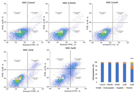 In MSCs, CuNPs induced a dose-dependent increase in the number of apoptotic cells, while the necrotic fraction remained low (4.6%), suggesting a predominantly controlled apoptotic response. A significant increase in apoptotic cell counts (p < 0.001) was observed mainly at the highest concentrations tested (2 mM). Representative dot plots illustrate the distribution of viable, early apoptotic, apoptotic and necrotic cells in response to CuNPs (Figure 4).