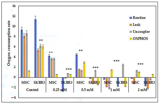 Oxygen consumption rates in MSCs and SKBR3 cells following CuNP treatments, assessed using the Oroboros 2k high-resolution spirometry system. The figure illustrates the effects of CuNPs on routine respiration (R), leak respiration (L), maximal respiratory capacity (M) and oxidative phosphorylation capacity (OXPHOS). Representative oxygraph depicting oxygen consumption dynamics and basal respiration are shown in the Supplementary Files (Figures S2 and S3). Statistical significance is denoted as follows: ** p < 0.01 and *** p < 0.001.