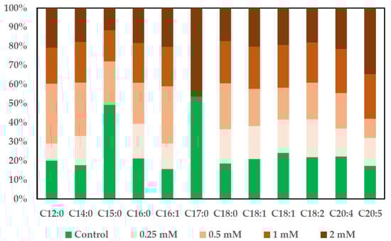The general proportion of FAMEs in the SKBR3 cell line (Figure 10) was almost identical in the control and the CuNP-treated cells, albeit with some exceptions. For the SKBR3 cells, the percentage of heptadecanoic acid was found to be similar in the control and the 2 mM treated cells. Another peculiarity appears in the percentage profile of the pentadecanoic acid, which was found to be present in all samples except for the 0.25 mM treated cells. The lowest percentages of FAMEs were obtained in the 0.25 mM treated cells. The highest percentage of PUFA was obtained for the eicosapentaenoic acid in the 2 mM treated cells.