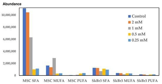 Regarding the saturated and unsaturated FAME profiles, a difference between MSCs and SKBR3 cells could be seen. A common behavior of FAMEs is a decrease in all types of cells from the control to the lowest concentration (0.25 mM) of CuNPs (Figure 11). Although a slight decline in saturated fatty acid (SFA) levels is observed in both types of cells as CuNP concentration decreases, for the last two concentrations, the levels are similar. SKBR3 cells are richer in unsaturated fatty acids than MSCs, and overall, the 0.5 mM concentration is the one inducing a decrease in all types of fatty acids.