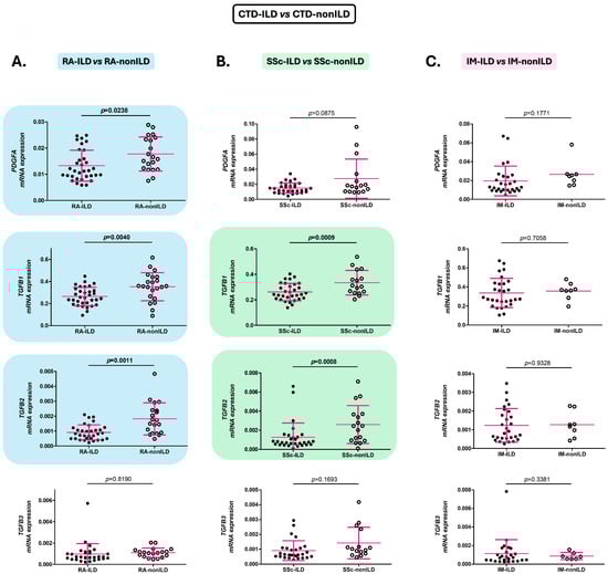 Similarly, patients with RA-ILD and SSc-ILD revealed similar expression of the analyzed genes (PDGFA, TGFB1, TGFB2, and TGFB3) to IPF patients (Figure 2A,B).