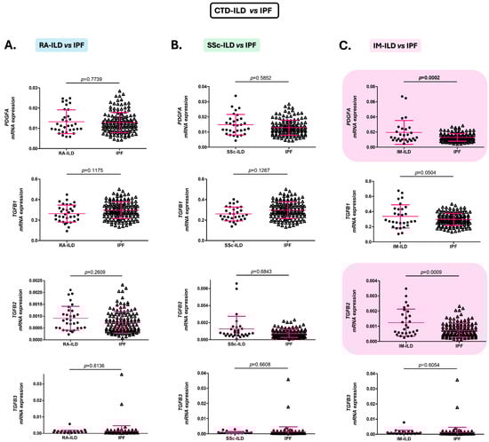 Role of PDGFA, TGFB1, TGFB2, and TGFB3 in the discrimination between patients with CTD-ILD and IPF. Differences in PDGFA, TGFB1, TGFB2, and TGFB3 expression in blood of patients with RA-ILD versus those with IPF (A), with SSc-ILD versus IPF patients (B), and with IM-ILD versus those with IPF (C). CTD: connective tissue diseases; ILD: interstitial lung disease; IPF: idiopathic pulmonary fibrosis; RA: rheumatoid arthritis; PDGFA: platelet-derived growth factor subunit A; TGFB: transforming growth factor beta; SSc: systemic sclerosis; IM: inflammatory myopathy. Significant results are highlighted.