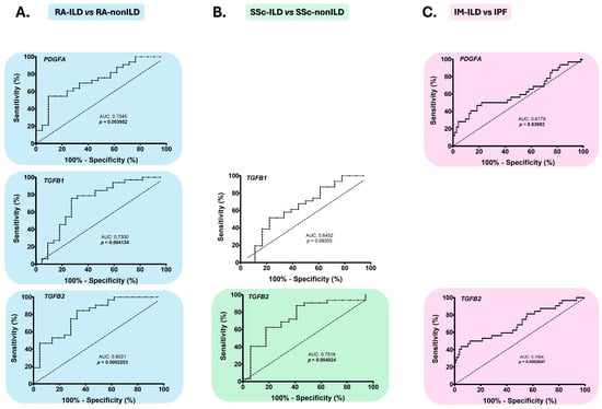 Role of PDGFA, TGFB1, TGFB2, and TGFB3 in the identification of ILD in CTD patients. Differences in PDGFA, TGFB1, TGFB2, and TGFB3 expression in blood of patients with RA-ILD versus those with RA-nonILD (A), with SSc-ILD versus those with SSc-nonILD (B), and with IM-ILD versus those with IM-nonILD (C). CTD: connective tissue diseases; ILD: interstitial lung disease; RA: rheumatoid arthritis; PDGFA: platelet-derived growth factor subunit A; TGFB: transforming growth factor beta; SSc: systemic sclerosis; IM: inflammatory myopathy. Significant results are highlighted.