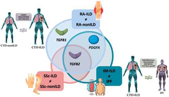 In conclusion, PDGFA and TGFB could be promising blood biomarkers of systemic disease modulation in CTD-ILD. As part of a markers broader panel and when combined with other clinical, imaging, or functional parameters, they may have potential clinical value in the early and accurate diagnosis of CTD-ILD, helping to overcome the challenges posed by this disease in clinical practice.