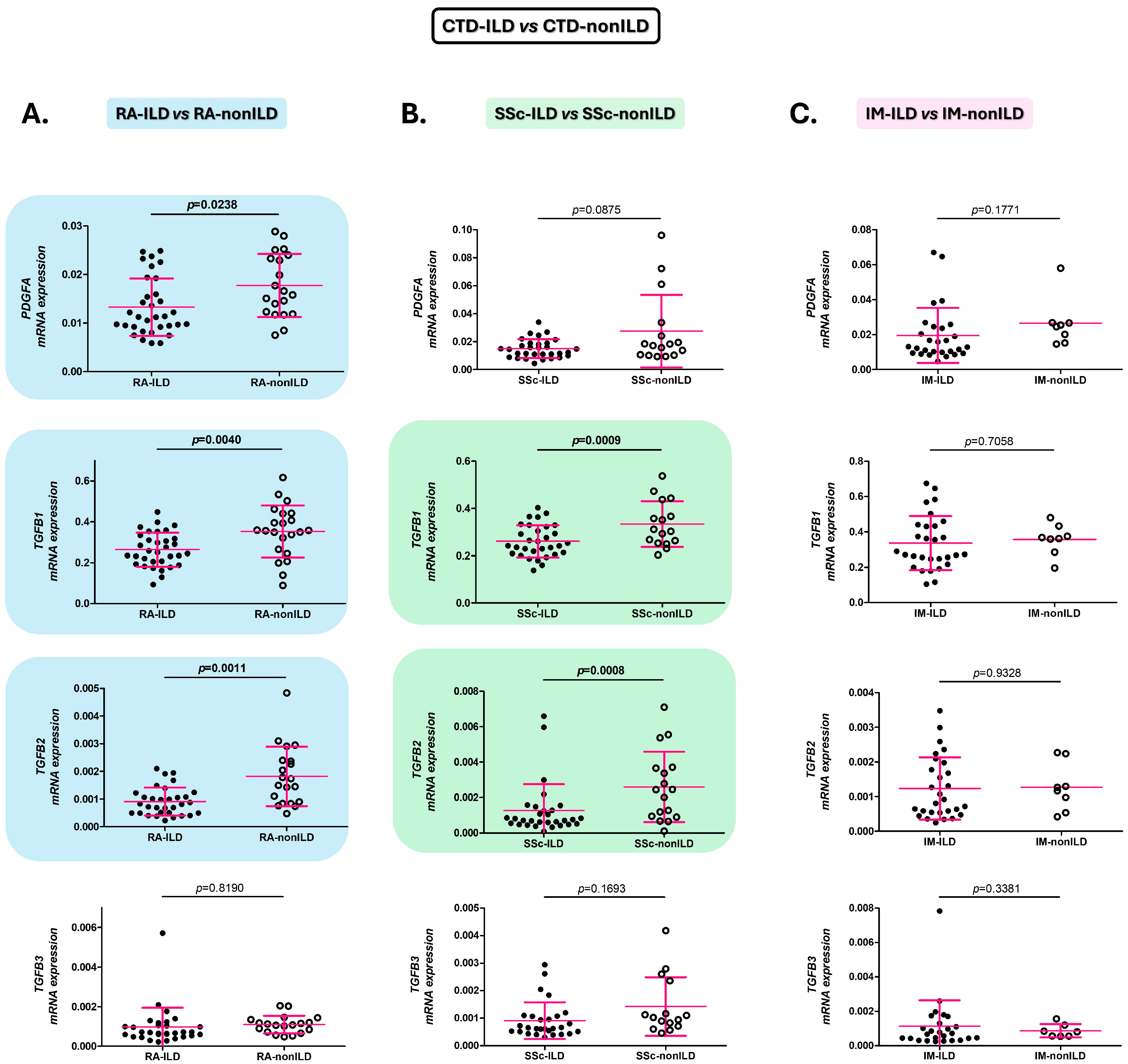 | RA-ILD n = 33 | SSc-ILD n = 31 | IM-ILD n = 29 | RA-nonILD n = 22 | SSc-nonILD n = 18 | IM-nonILD n = 8 | IPF n = 148 | |