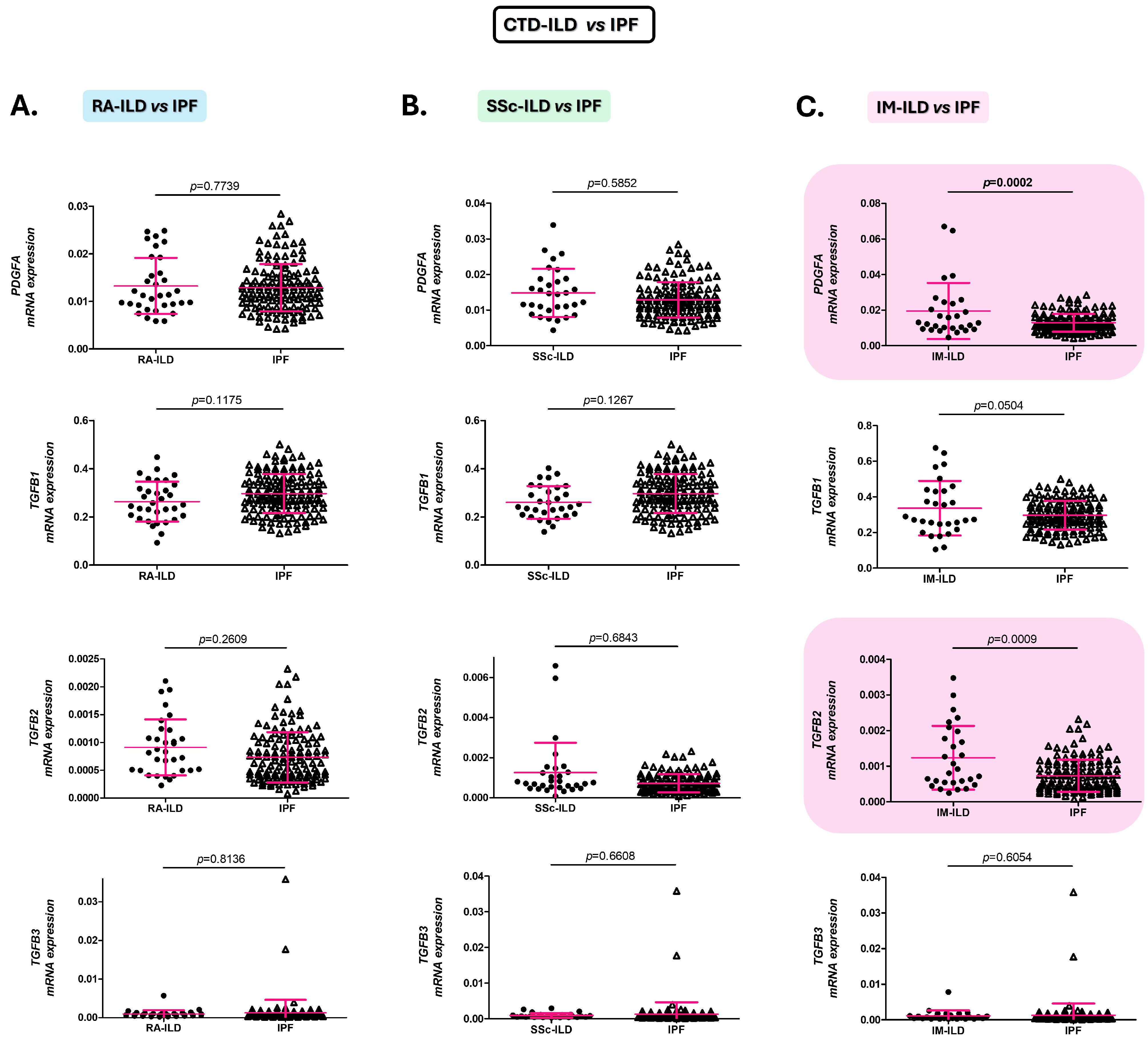 2.2. Alterations of the PDGFA and TGFB2 Expression in the Blood Distinguish Patients with IM-ILD from Those with IPF