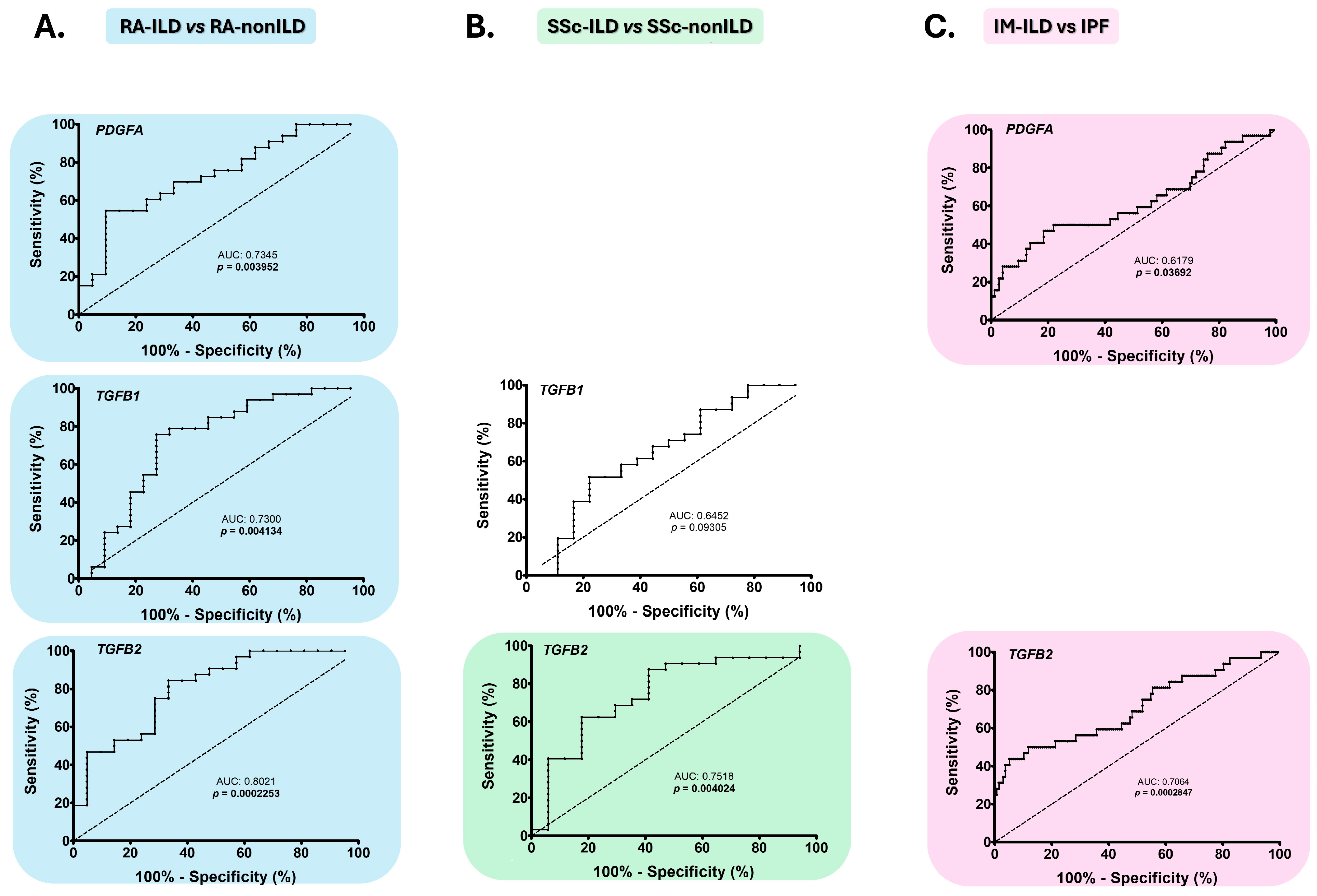 2.3. PDGFA, TGFB1, and TGFB2 as Early Diagnostic Biomarkers of the Presence of ILD in RA and SSc