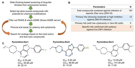 - Gallo, F.N.; Marquez, A.B.; Fidalgo, D.M.; Dana, A.; Dellarole, M.; García, C.C.; Bollini, M. Antiviral Drug Discovery: Pyrimidine Entry Inhibitors for Zika and Dengue Viruses. Eur. J. Med. Chem. 2024, 272, 116465. [Google Scholar] [CrossRef] [PubMed]