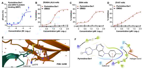 Characterization of Pyrimidine-Der1 compound for binding and inhibition ability. (A) The binding of Pyrimidine-Der1 to the ZIKV envelope (E) protein by microscale thermophoresis (MST) assay, with the calculated dissociation constant (KD) of 7.02 µM. The data is presented as the mean ± standard deviation of the mean (s.e.m) of duplicate samples. The experiments were repeated once, resulting in similar results. (B–D) Pyrimidine-Der1 inhibited the binding of ZIKV E-specific antibodies to the E protein. The plates were coated with the ZIKV E protein, and ELISA was performed to test the ability of Pyrimidine-Der1 to inhibit E-specific neutralizing monoclonal antibodies (mAbs) for binding to the E protein. The percent inhibition (% inhibition) of the compound for the binding between ZKA64-LALA (B), Z004 (C), and ZV-67 (D) mAbs, respectively, and the E protein was calculated in the presence or absence of the serially diluted compound based on the OD450 values, with the 50% inhibitory concentration (IC50) of 10.52 µM, 11.67 µM, and 12.62 µM, respectively. The data (in (B–D)) is presented as the mean ± s.e.m of duplicate wells of one experiment. The experiments (in (B–D)) were repeated three times, resulting in similar results. (E,F) Predicted binding pose (GLIDE Docking) of one of the active ZIKV entry inhibitors, Pyrimidine-Der1, on the Crystal structure of ZIKV envelope (E) glycoprotein in complex with Fab C10 mAb (PDB: 7a3u). A cation-pi interaction was observed between K316 and W101 in the dimer interface of ZIKV E protein (PDB: 5JHM) (E) [18,26]. We observed a similar cation-pi interaction between K316 of ZIKV E protein and the phenyl ring of Pyrimidine-Der1, and interestingly, we also noted a halogen bond between Cl of the molecule and E329 of ZIKV E protein (F).