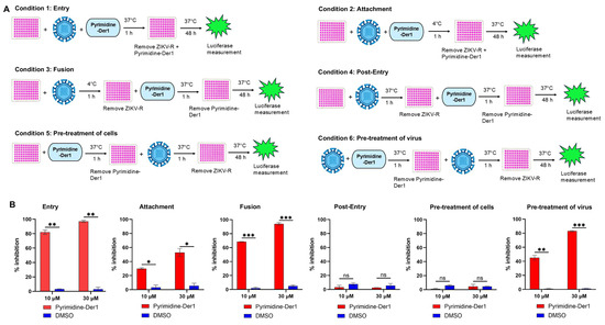 Time of addition experiment to identify potential inhibitory mechanism of Pyrimidine-Der1 to block infection of ZIKV-R. Below 6 conditions were tested (A). Condition 1 (Entry): Vero-E6 cells were co-treated with the virus and compound at 37 °C. Condition 2 (Attachment): The cells were co-treated with the virus at 4 °C in the presence of the compound. Condition 3 (Fusion): the cells were pretreated with the virus at 4 °C first, and then incubated with the compound at 37 °C. Condition 4 (Post-entry): The cells were pretreated with the virus, and then incubated with the compound, both of which being at 37 °C. Condition 5 (Pre-treatment of cells): The cells were pretreated with the compound at 37 °C, followed by incubation with the virus. Condition 6 (Pre-treatment of virus): The virus was pretreated with the compound at 37 °C, followed by incubation with the Vero-E6 cells. (B) Vero-E6 cells were infected with ZIKV-R at different conditions with or without the treatment of Pyrimidine-Der1 as described above, and the percent inhibition (% inhibition) was calculated by measuring the relative luciferase activity. The data (in (B)) is presented as the mean ± s.e.m of duplicate wells of one experiment. The experiments (in (B)) were repeated three times, resulting in similar results. Significance (p value) was based on the Student’s t-test between the Pyrimidine-Der1 and DMSO. *, **, and *** indicate p < 0.05, p < 0.01, and p < 0.001, respectively. ns = not significant.