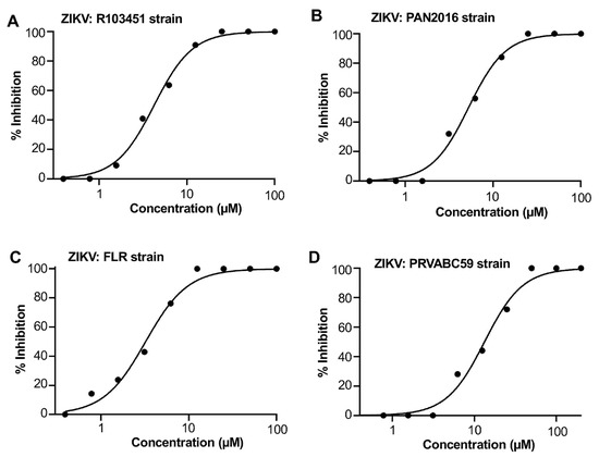 Pyrimidine-Der1 was further evaluated for its broad-spectrum ability against infection of different human strains of ZIKV, including FLR, PAN2016, and PRVABC59. The plaque inhibition assay was performed, and the relative IC50 values were calculated based on the inhibition rate in the presence or absence of the test compound. A strong dose-dependent inhibition of the compound was identified for all viruses tested (Figure 5A–D). In addition to inhibiting ZIKV R103451 strain, this compound potently blocked infection of FLR and PAN2016 strains (IC50 values ranging from 3.23 to 5.27 µM) (Figure 5A–C); it also effectively inhibited infection (IC50: 13.33 µM) of PAVABC59 strain (Figure 5D), a strain presenting relatively lower homology in the E protein when compared with the those of the above ZIKV strains tested. These data confirms the broad inhibitory ability of the lead small molecule against infection of different authentic ZIKV variants.