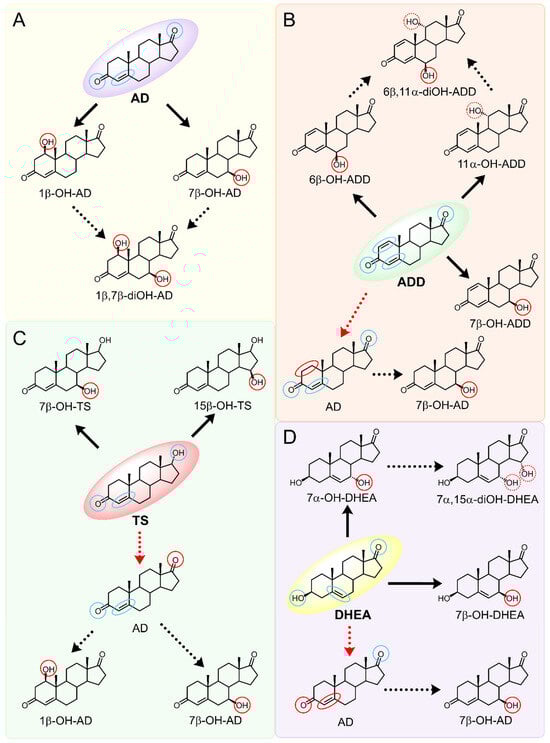 The hydroxylation of steroids by the P450 BM3-LG23 mutant in vivo in M. smegmatis BD (pVP1): androstenedione (AD) (A), androstadienedione (ADD) (B), testosterone (TS) (C), dehydroepiandrosterone (DHEA) (D). Black continuous arrows indicate reactions carried out by P450 BM3-LG23; black dotted arrows indicate putative bioconversion pathways; red dotted arrows indicate reactions carried out by the strain’s own enzymes—17β-HSD and 1(2)-reductase; blue ovals indicate the location of double bonds in the substrate molecule; red ovals indicate changes to the location of double bonds in the product molecule; blue circles indicate the location of hydroxyl/keto groups in the substrate molecule; red continuous circles indicate the sites of β-hydroxylation in the substrate molecule and the β-OH group position in the product molecule; red dotted circles indicate the sites of α-hydroxylation in the substrate molecule and the α-OH group position in the product molecule.