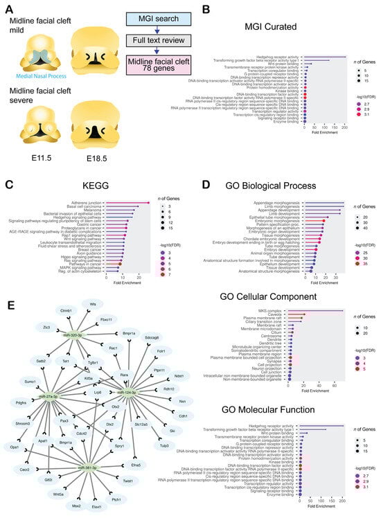 A comprehensive gene search for midline facial clefts in mice was conducted using the MGI database (https://www.informatics.jax.org) in September 2024, with terms related to facial clefts and cleft lip. Each gene was evaluated alongside relevant literature for mouse phenotypes, and only those exhibiting a midline cleft phenotype were included in the analysis. To predict miRNA–target gene regulation, several tools, including miRTarbase, miRanda, PITA, and TargetScan, were utilized, as previously described []. Fisher’s exact test was employed to assess the significance of shared genes among miRNA targets and genes associated with midline facial clefts in mice. To ensure the robustness of our findings, the Benjamini–Hochberg procedure was applied for multiple test corrections. Pathway analysis was conducted using the Kyoto KEGG and GO enrichment analysis (http://www.geneontology.org) was performed using ShinyGO 0.81 [], focusing on biological process (BP), cellular component (CC), and molecular function (MF) [,,,]. Categories with significant enrichment for the relevant genes were filtered using a false discovery rate (FDR)-adjusted p-value of less than 0.05, requiring at least four genes associated with midline facial clefts. The p-value was calculated through a hypergeometric test, and to avoid overly general GO terms, we applied a hierarchical level 4 cut-off.