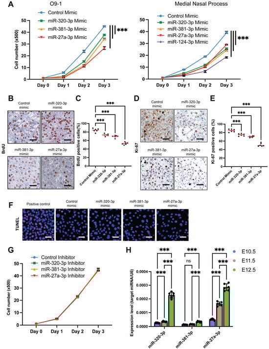 To investigate the role of these candidate miRNAs (miR-320-3p, miR-381-3p, miR-27a-3p, and miR-124-3p) in regulating cell proliferation, we conducted cell proliferation assays using specific mimics for each miRNA in O9-1 cells and primary MNP-derived mesenchymal cells. Our results showed that the overexpression of miR-320-3p, miR-381-3p, and miR-27a-3p significantly inhibited cell proliferation in both cell types (Figure 2A). We further confirmed these results with BrdU incorporation assays (Figure 2B,C) and immunocytochemical analyses for Ki-67 (Figure 2D,E). TUNEL assay for cell death did not show any induction of apoptosis (Figure 2F), indicating that the primary effect of these miRNAs on O9-1 cells is the suppression of cell proliferation. The use of specific inhibitors for these miRNAs did not affect cell proliferation (Figure 2G). Notably, expression of these miRNAs at E10.5 and E11.5 was low in the developing midfacial region and elevated at E12.5 when the development of the midfacial region was completed (Figure 2H). Therefore, we conclude that the overexpression of these miRNAs, rather than their inhibition, leads to decreased cell proliferation in O9-1 cells. Our previous study shows that treatment with miR-124-3p mimic on O9-1 cells and primary MNP-derived mesenchymal cells suppresses cell proliferation, whereas treatment with the miR-124-3p inhibitor does not [], as observed with the other three candidate miRNAs.