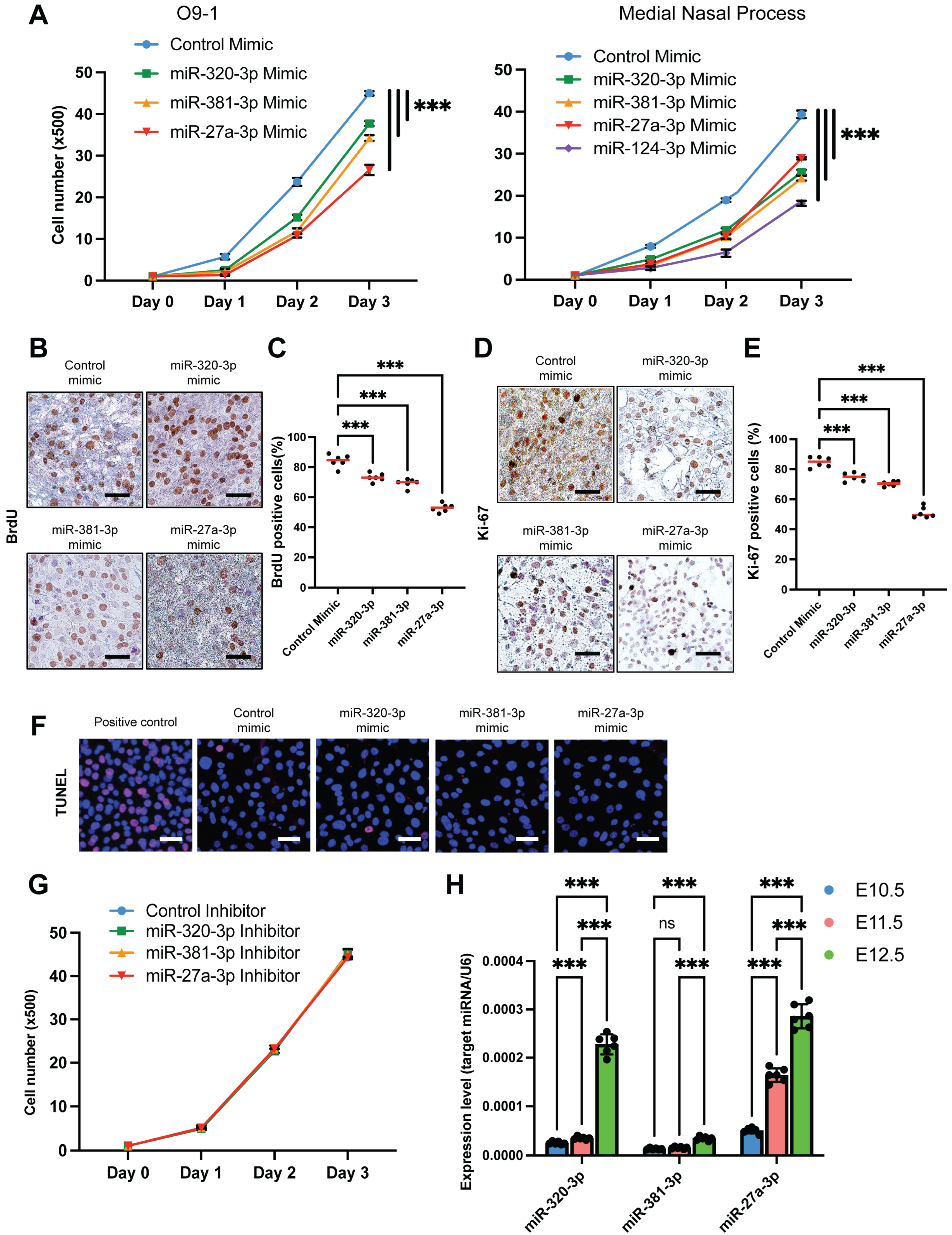 2.2. Mimics for miR-320-3p, miR-381-3p, and miR-27a-3p Inhibits Cell Proliferation by Suppressing Genes Associated with Midline Facial Clefts in O9-1 Cells and MNP-Derived Mesenchymal Cells