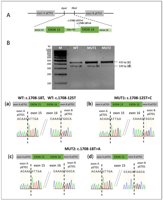 (A) Scheme of minigene with variants c.1708-18T>A and c.1708-125T>C. The pET01 vector fragments are colored in gray, the SLC26A4 gene fragments—in green. ApaI, XbaI—the recognition sites for restriction endonucleases. (B). The results of minigene assay (obtained on the HEK293T cell line) for variants c.1708-18T>A, c.1708-125T>C and the corresponding wild types. The SLC26A4 transcripts visualized by agarose gel electrophoresis. (a–d)—schematic representation of the splicing results and partial Sanger sequencing results of PCR products for the wild type (WT) (a), for the c.1708-125T>C mutant variant (MUT1) (b), and for the c.1708-18T>A mutant variant (MUT2) (c,d). M—100 bp marker. The SLC26A4 transcripts were also visualized by capillary electrophoresis (Bio-Fragment Analyzer Qsep1) (Supplementary Materials: Figure S2).