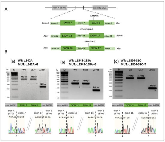 (A) Schemes of minigenes with variants c.942A>G, c.1545-168A>G, and c.1804-31C>T. The pET01 vector fragments are colored in gray, the SLC26A4 gene fragments—in green. ApaI, XbaI, BamHI—the recognition sites for restriction endonucleases. (B). The results of minigene assay (obtained on the HEK293T cell line) for variants c.942A>G, c.1545-168A>G, c.1804-31C>T and the corresponding wild types: schematic representation of the splicing results, visualization by agarose gel electrophoresis, and partial Sanger sequencing results of PCR products. (a) WT: c.942A and MUT: c.942A>G; (b) WT: c.1545-168A and MUT: c.1545-168A>G; (c) WT: c.1804-31C and MUT: c.1804-31C>T. WT—wild type; MUT—mutant variant; pET01—pET01 vector without insertion; *—PCR products resulting from the activation of cryptic splicing sites in the genetic construct used. M—100 bp marker. The SLC26A4 transcripts were also visualized by capillary electrophoresis (Bio-Fragment Analyzer Qsep1) (Supplementary Materials: Figure S3).
