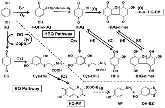 Since dopa-derived EM and PM provide various useful markers upon degradation reactions, we attempted to find HQ-PM-specific markers. HI hydrolysis of HQ-PM gives AP just like dopa-PM gives AHP isomers [29]. In our recent study [17], analyses of HQ-exposed melanocytes and tyrosinase-transfected cells confirmed the production of AP after HI hydrolysis [17], indicating that the oxidation of HQ to BQ did in fact take place in melanocytes. Production of Cys-HQ (and glutathionyl-HQ) was also confirmed in the tyrosinase-transfected T 293 T cells [17]. It should be noted, however, that in those in vitro experiments, we faced difficulties due to cytotoxicity and metabolites production that are independent of tyrosinase activity. This may be ascribed to the tendency of HQ to undergo auto-oxidation to form BQ and subsequent oligomeric products.