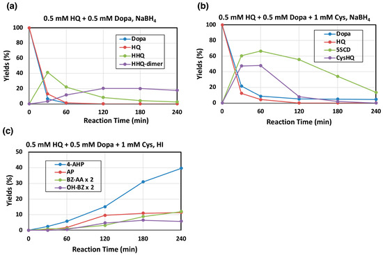Comparison of Figure 5a,b shows that HHQ, a major product of HBQ pathway, was produced in a 41% yield at 30 min, while Cys-HQ, a major product of the BQ pathway in the presence of cysteine, was produced in 47% yield. This result suggests that a shift from the HBQ pathway to the BQ pathway occurs when cysteine is present.