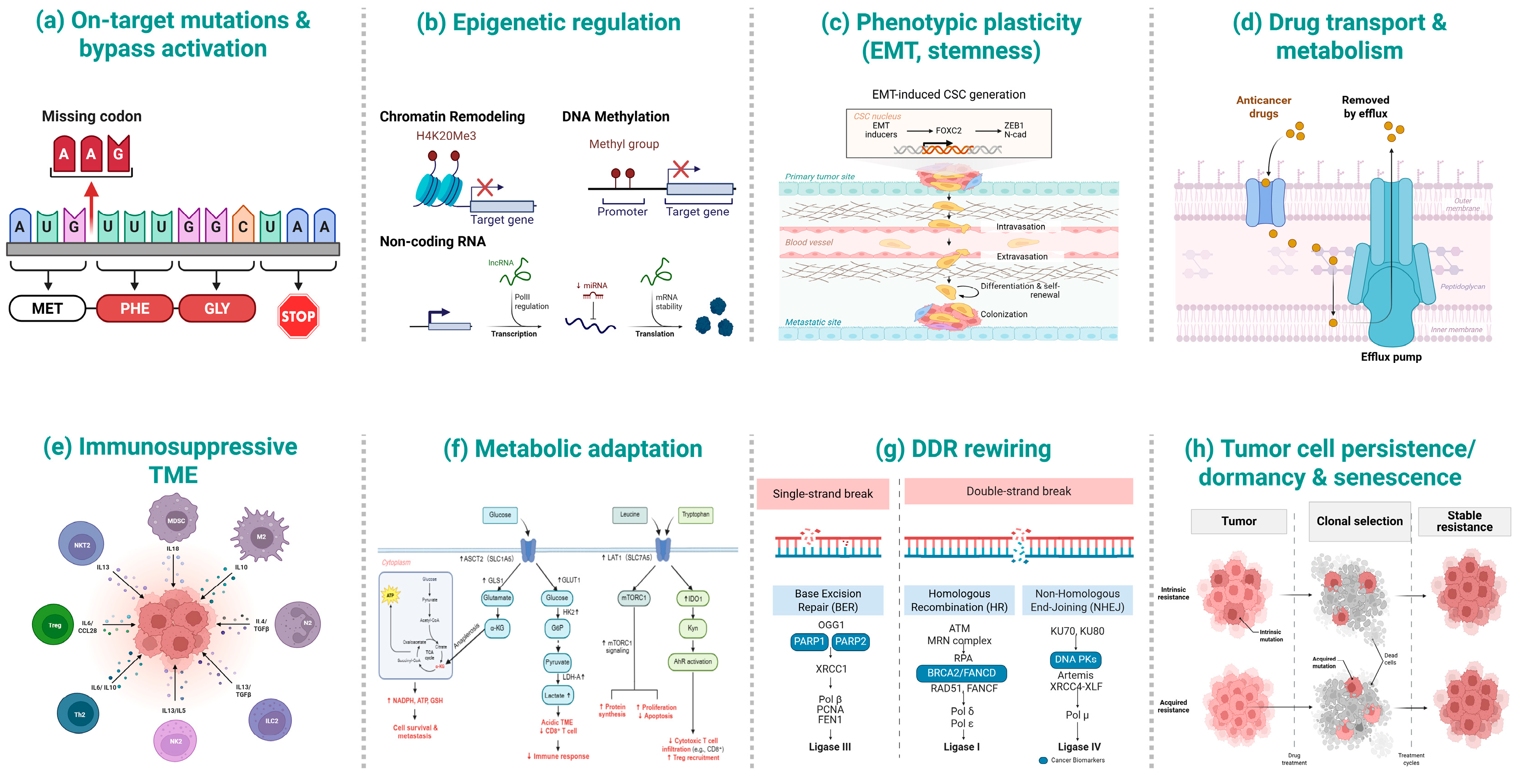 | Phenotypic plasticity (EMT, stemness) | EMT-TFs [44], YAP/TAZ [45] | Promotes migration, invasion, and drug tolerance [46] | Highlights EMT/CSC-targeted and microenvironmental interventions [47] |