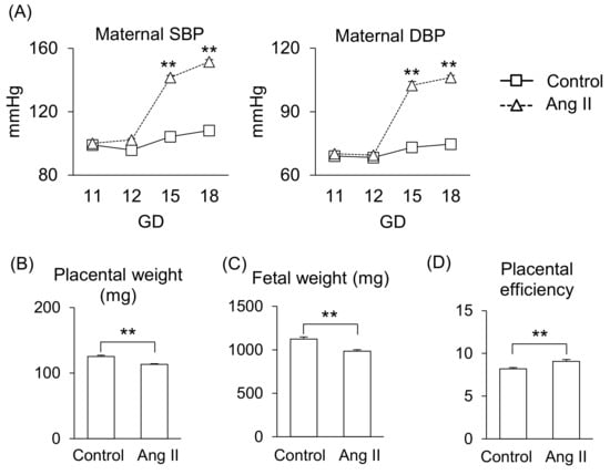 First, we determined the effect of Ang II during pregnancy in mice. Ang II infusion on gestational day (GD) 12 significantly increased systolic blood pressure (SBP) and diastolic blood pressure (DPB) compared to that of the control group (Figure 1A), consistent with our previous report []. Also, Ang II infusion significantly reduced placental weight and fetal weight (Figure 1B,C), resulting in a shift in the balance of placental efficiency (Figure 1D).