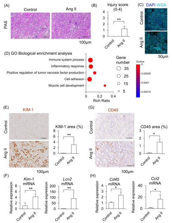 Effect of Ang II on maternal kidneys in pregnant mice. Pregnant mice were infused with Ang II on GD12. (A) Representative image of periodic acid-Schiff (PAS)-staining in the kidneys. (B) Tubular injury score of PAS staining samples of kidneys. (C) Representative image of glomerulus stained by WGA and DAPI. (D) GO biological enrichment analysis of differentially regulated genes in the kidneys between the control and Ang II; the top five pathways are displayed. (E) Representative images of immunohistochemistry for the KIM-1 are shown, and KIM-1-positive areas were quantified. (F) mRNA levels of Kim-1 and Lcn2 in the maternal kidneys. (G) Representative image of immunohistochemistry for the CD45 are shown, and CD45-positive areas were quantified. (H) mRNA levels of Cd45 and Ccl2 in the maternal kidneys were analyzed by RT-qPCR. Data are expressed as mean ± SEM. * p < 0.05 or ** p < 0.01.