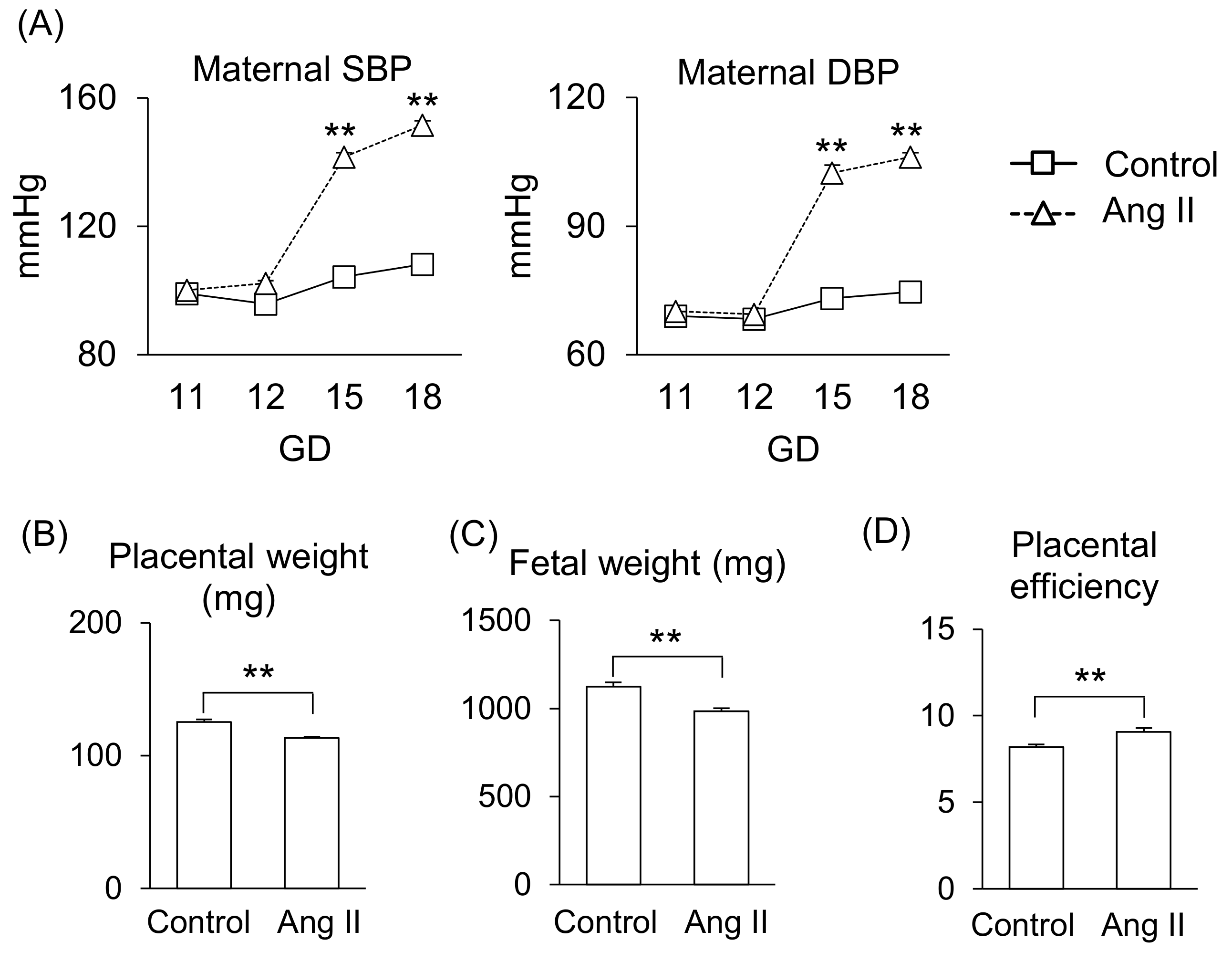Figure 1. Effects of Ang II on maternal responses during pregnancy. Pregnant mice were infused with Ang II on GD12. (A) Maternal SBP and DBP. (B,C) Placental and fetal weights on GD18. (D) Placental efficiency was calculated by dividing fetal weight by placental weight. Data are expressed as mean ± SEM. ** p < 0.01.