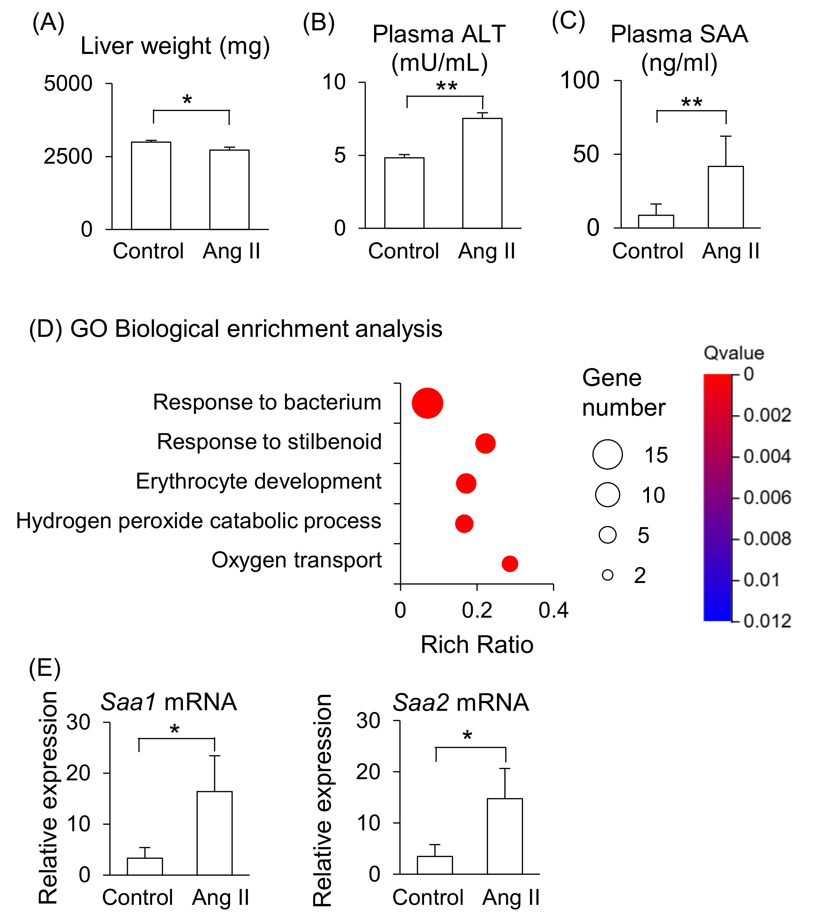 Figure 2. Effects of Ang II on maternal liver in pregnant mice. Pregnant mice were infused with Ang II on GD12. (A) Liver weight on GD18. (B,C) ALT and SAA levels in peripheral blood plasma on GD18. (D) GO biological enrichment analysis of differentially regulated genes in the liver between the control and Ang II; the top five pathways are displayed. (E) mRNA levels of Saa1 and Saa2 in the maternal liver were analyzed by RT-qPCR. Data are expressed as mean ± SEM. * p < 0.05 or ** p < 0.01.