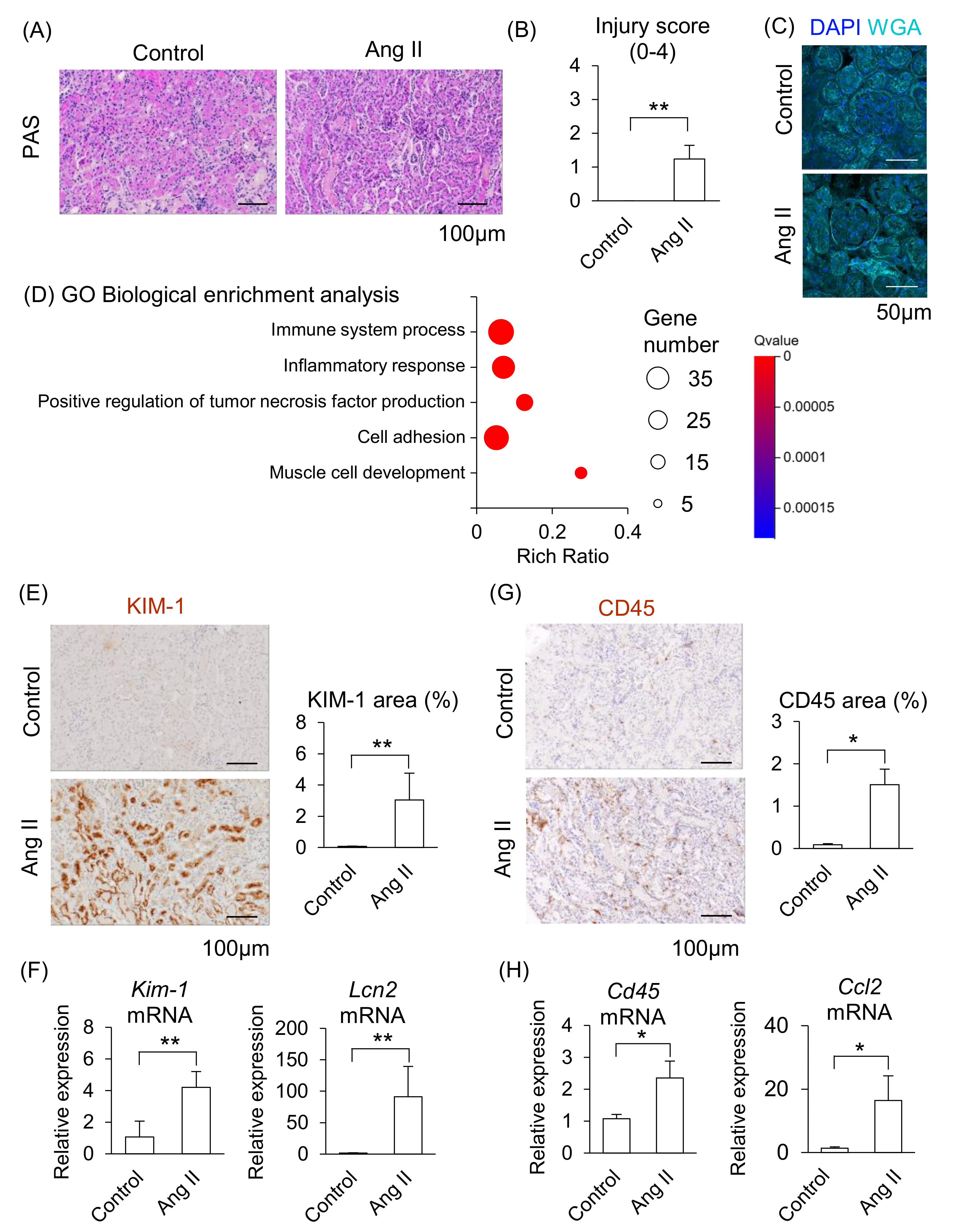 Figure 3. Effect of Ang II on maternal kidneys in pregnant mice. Pregnant mice were infused with Ang II on GD12. (A) Representative image of periodic acid-Schiff (PAS)-staining in the kidneys. (B) Tubular injury score of PAS staining samples of kidneys. (C) Representative image of glomerulus stained by WGA and DAPI. (D) GO biological enrichment analysis of differentially regulated genes in the kidneys between the control and Ang II; the top five pathways are displayed. (E) Representative images of immunohistochemistry for the KIM-1 are shown, and KIM-1-positive areas were quantified. (F) mRNA levels of Kim-1 and Lcn2 in the maternal kidneys. (G) Representative image of immunohistochemistry for the CD45 are shown, and CD45-positive areas were quantified. (H) mRNA levels of Cd45 and Ccl2 in the maternal kidneys were analyzed by RT-qPCR. Data are expressed as mean ± SEM. * p < 0.05 or ** p < 0.01.