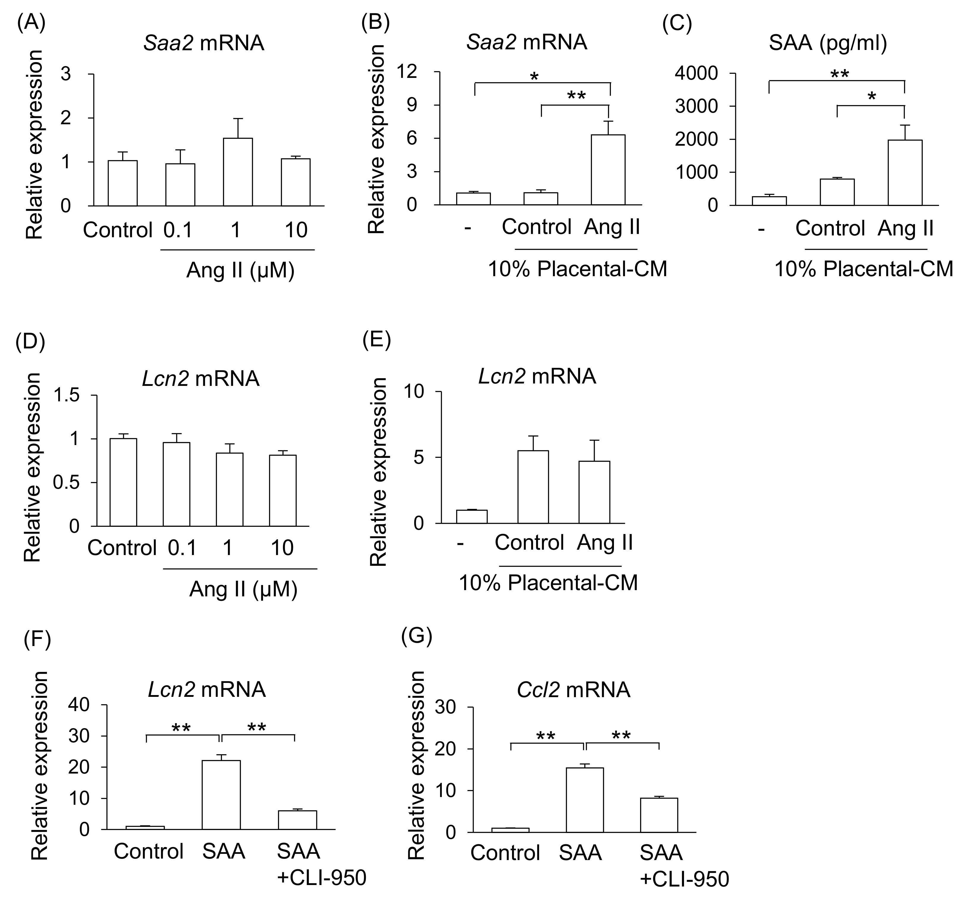 As neither placental-CM nor Ang II affected kidney tubular cells, we focused on function of SAA on the kidneys. As a result, treatment with SAA significantly increased the mRNA expression of Lcn2 and Ccl2 on kidney tubular cells (Figure 4F,G). In addition, treatment with toll-like receptor 4 (TLR4) inhibitor (CLI-950) significantly suppressed these SAA effects (Figure 4F,G).