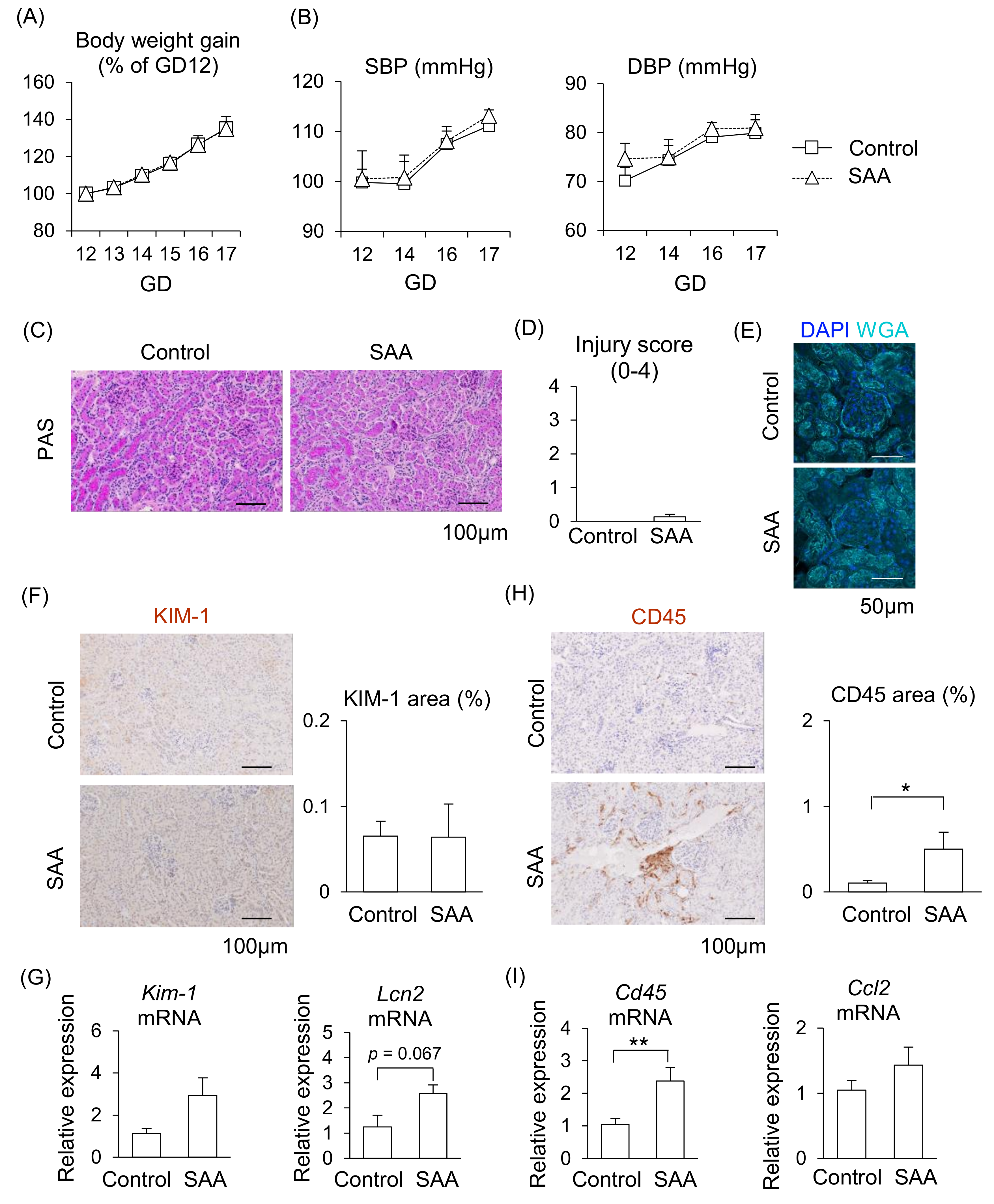 Figure 5. Effect of SAA on kidneys in pregnant mice. Pregnant mice were injected with SAA on GD12-16. (A) Maternal body weight gain during pregnancy. (B) Maternal blood pressure (SBP and DBP) were measured during pregnancy. (C) Representative image of the kidney with PAS staining. (D) Tubular injury score was examined using PAS staining. (E) Representative image of glomerulus stained by WGA and DAPI. (F) Representative images of immunohistochemistry for the KIM-1 were shown, and KIM-1-positive areas were quantified. (G) mRNA levels of Kim-1 and Lcn2 in the maternal kidneys. (H) Representative images of immunohistochemistry for CD45 are shown, and CD45-positive areas were quantified. (I) mRNA levels of Cd45 and Ccl2 in the kidneys. Data are expressed as mean ± SEM. * p < 0.05 or ** p < 0.01.