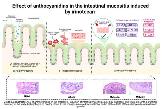 Machado, G.F.; Pereira, Q.C.; Fagundes, F.L.; Emílio-Silva, M.T.; Rodrigues, V.P.; Patiño, M.d.A.; Jorge, G.I.; Pereira, J.A.; Martinez, C.A.R.; Hiruma-Lima, C.A.; et al. The Anthocyanidins Malvidin and Cyanidin Alleviate Irinotecan-Triggered Intestinal Mucositis by Modulating Oxidative Stress and Cytokine Release. Int. J. Mol. Sci. 2025, 26, 10747. https://doi.org/10.3390/ijms262110747