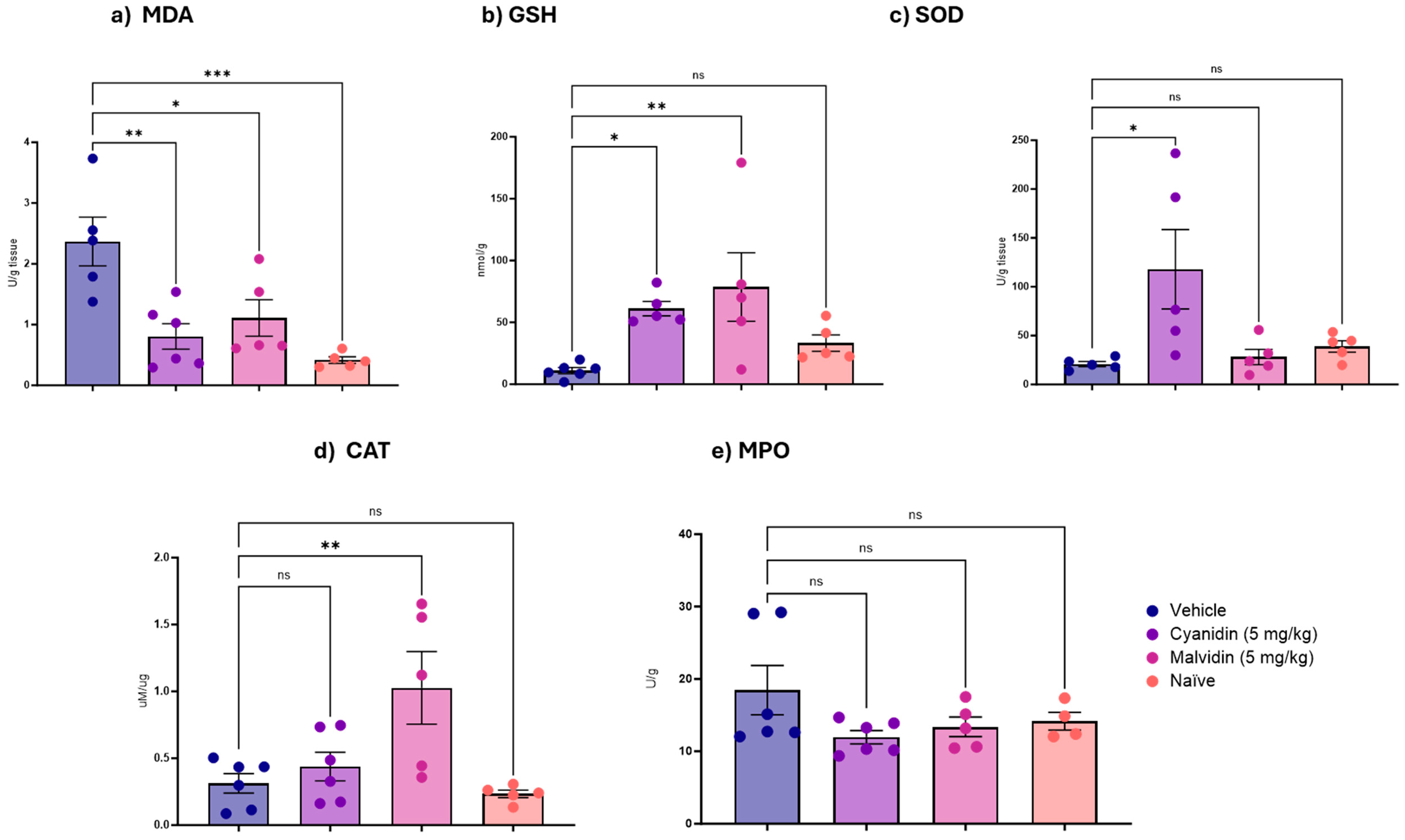 - Fagundes, F.L.; Pereira, Q.C.; Zarricueta, M.L.; dos Santos, R.d.C. Malvidin Protects against and Repairs Peptic Ulcers in Mice by Alleviating Oxidative Stress and Inflammation. Nutrients 2021, 13, 3312. [Google Scholar] [CrossRef] [PubMed]