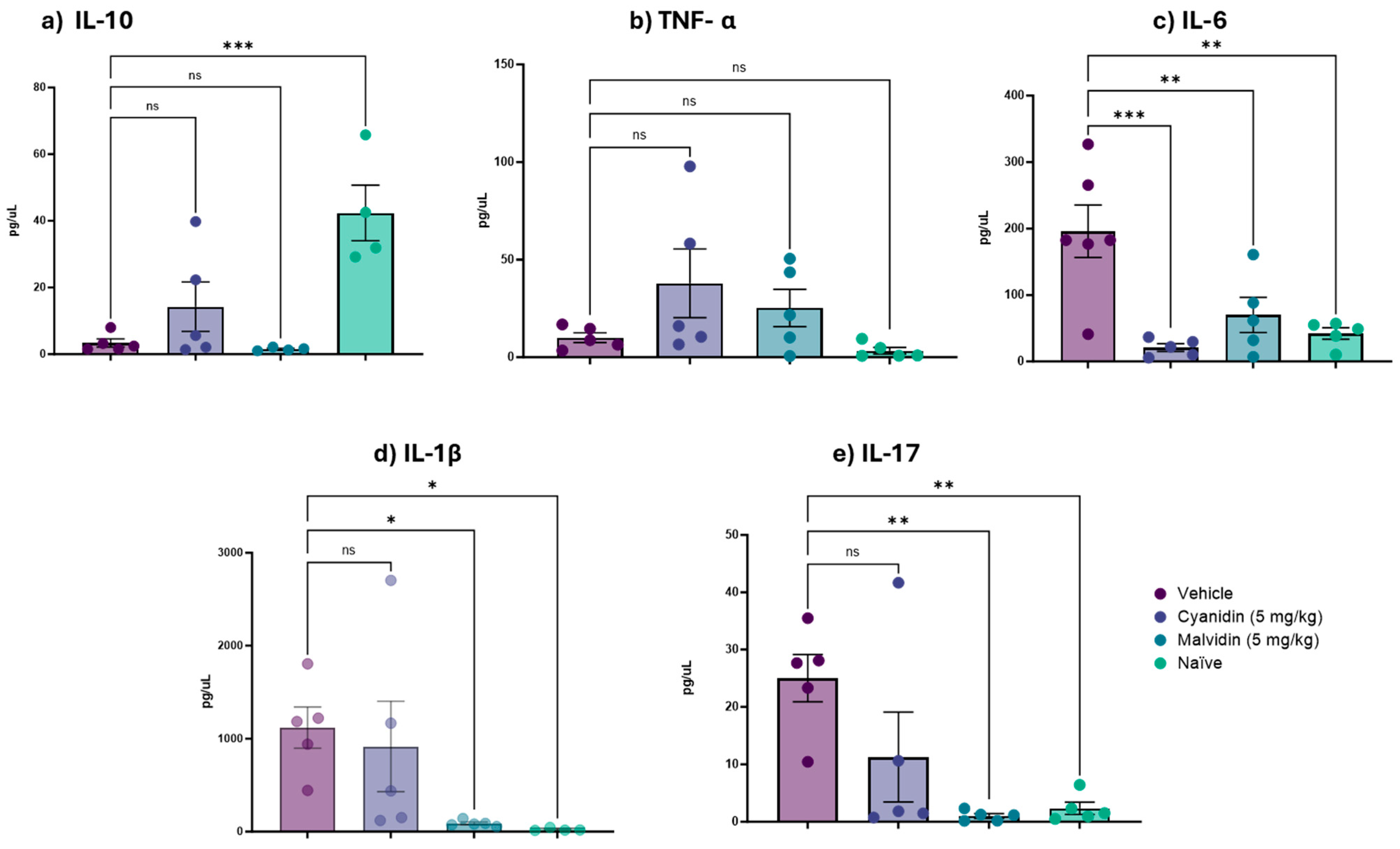2.3. Quantification of Cytokines Involved in the Inflammatory Response