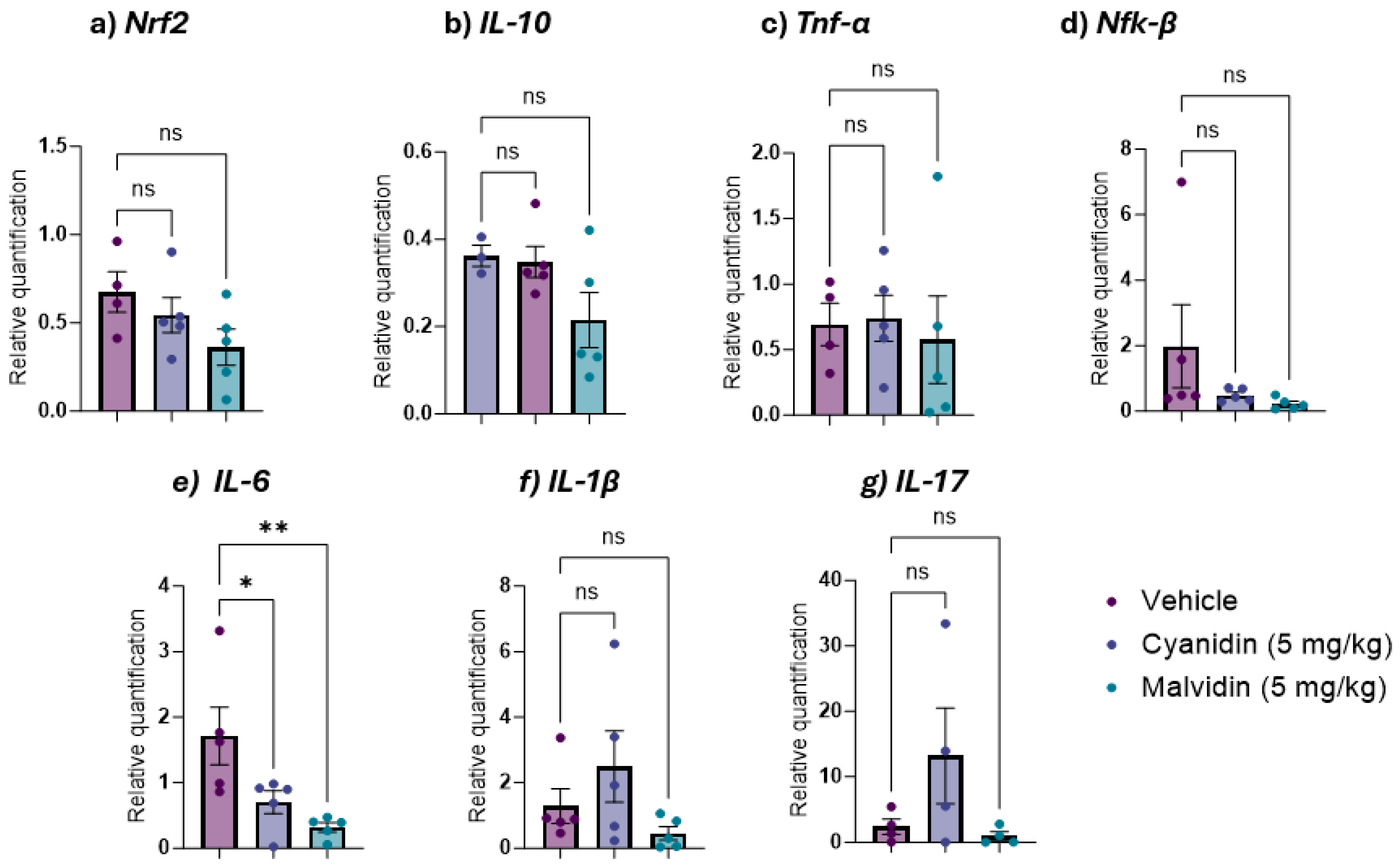 2.4. Gene Expression Analysis of Inflammatory and Antioxidant Markers