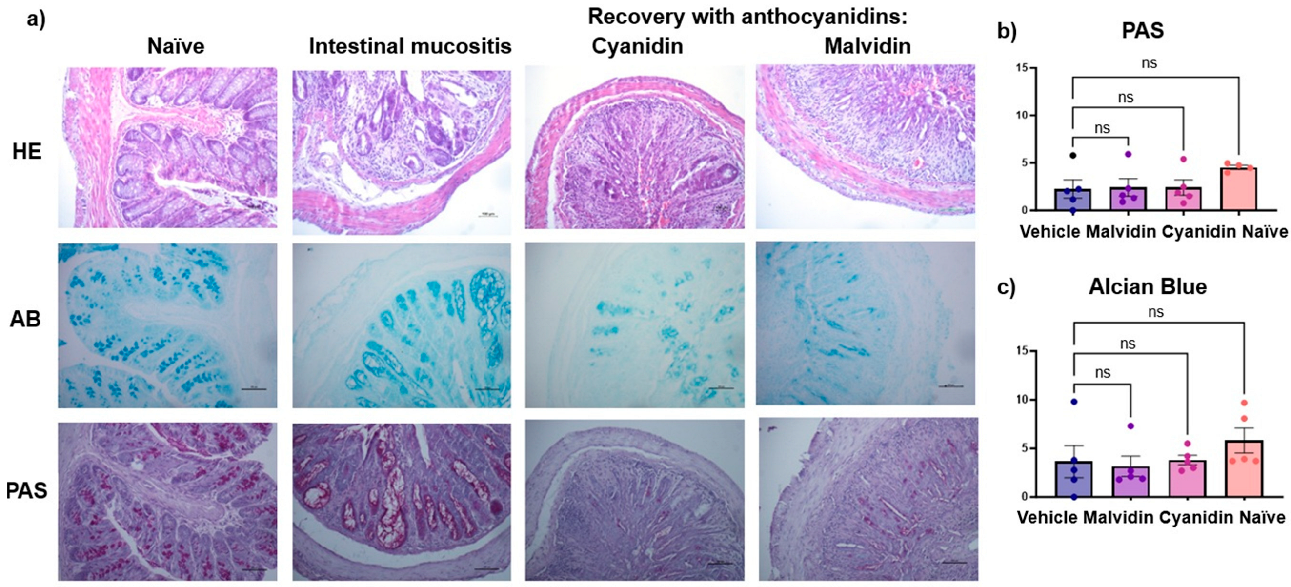 2.2. Analysis of Antioxidant Potential of Anthocyanidins in CPT-11 Chemotherapy-Induced Mucositis