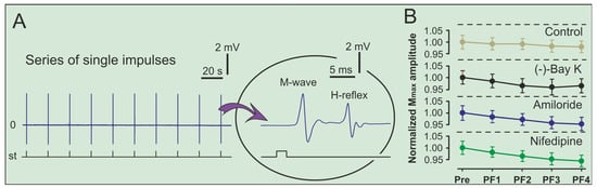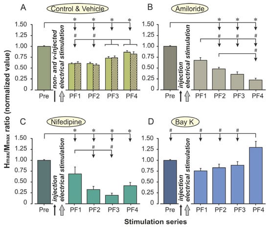 Electrical stimulation induced marked, time-dependent changes in the Hmax/Mmax ratio, which differed across experimental groups. A two-way repeated measures ANOVA was performed with the Time (one prefatigue [Pre] and four postfatigue registrations [PF1–PF4]) as the within-subjects factor and the Group (Control, Amiloride, Nifedipine, (−)-Bay K8644) as the between-subjects factor. This analysis assessed whether pharmacological modulation of calcium channels influenced the magnitude and recovery dynamics of the H-reflex following a standardized fatiguing protocol. No significant differences were observed between animals in the control and vehicle-injected groups; therefore, results are presented using the control group values. Group-wise comparisons of the Hmax/Mmax ratios across time points are shown in Figure 1A.