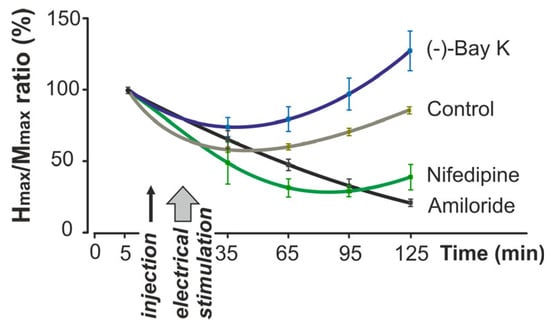 Changes in Hmax/Mmax ratio during the 125-min experimental protocol. Values are expressed as a percentage of the baseline measurements. Drug injection and electrical stimulation points are indicated on the timeline. The curves represent mean values ± SEM for each experimental group (Control, Amiloride, Nifedipine, and (−)-Bay K8644; n = 8 per group).