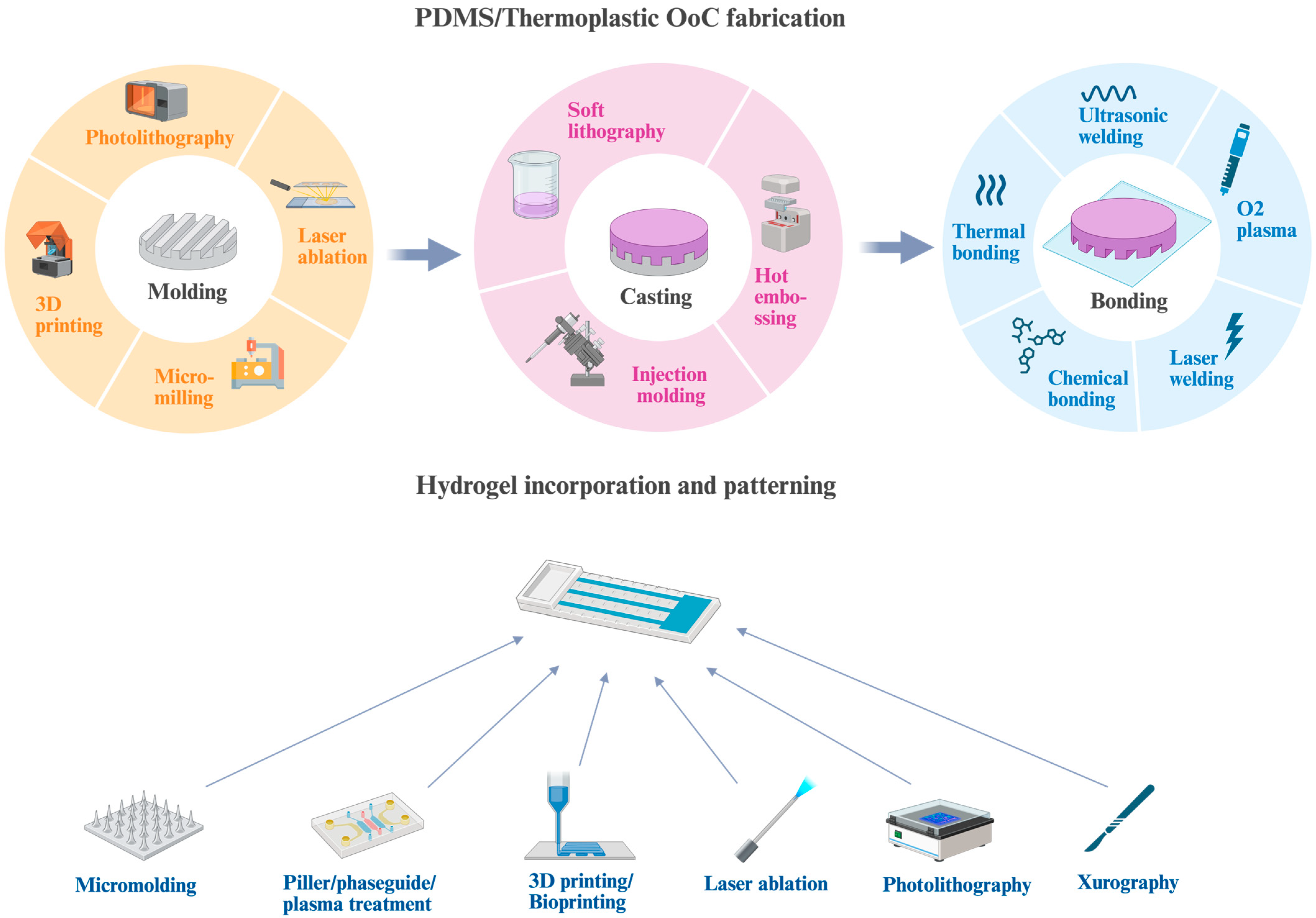 - Bai, H.; Olson, K.N.P.; Pan, M.; Marshall, T.; Singh, H.; Ma, J.; Gilbride, P.; Yuan, Y.C.; McCormack, J.; Si, L.; et al. Rapid Prototyping of Thermoplastic Microfluidic 3D Cell Culture Devices by Creating Regional Hydrophilicity Discrepancy. Adv. Sci. 2024, 11, e2304332. [Google Scholar] [CrossRef]