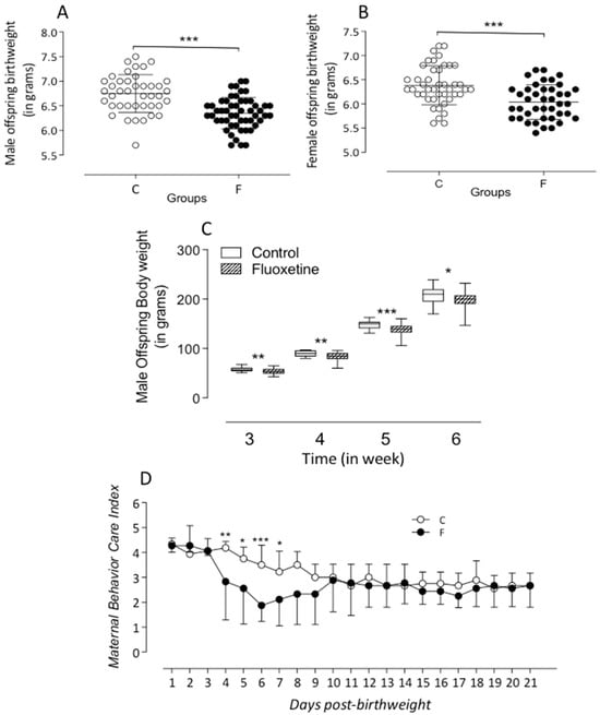 The figure shows the body weight (g) at birth of male (A) and female (B) fluoxetine (F) offspring. In the present study, after birth, all male or female animals were used to measure birth weight; however, only the male pups were studied and after lactation to 42 days of age (C), as compared to control (C) (offspring). The figure also includes the representative evolution of the maternal behavior care index (D) in the C and F groups during breastfeeding days. Our results, expressed as means ± SEM, were obtained over time and were analyzed using repeated-measures ANOVA. Fluoxetine exposure during pregnancy and breastfeeding significantly affected the offspring’s body weight and maternal care. The significance level was set at * p < 0.05, ** p < 0.001, and *** p < 0.0005.