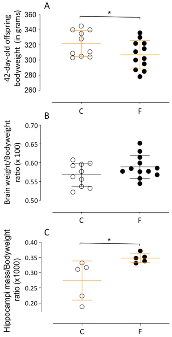 Representative graphics of the hippocampal effects of maternal and breastfeeding fluoxetine treatment on 42-day-old male F offspring compared to age-matched male C offspring on body weight, in grams (A), brain weight by body weight ratio (×100) (B), and hippocampal mass by body weight (×1000) (C). Results are depicted as a scatter dot-plot and are expressed as means ± SEM; comparisons involving only two means within or between groups were performed using Student’s t-test. The level of significance was set at * p < 0.05.