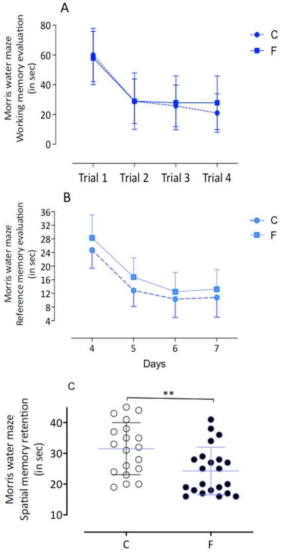 No differences in working memory were found between groups (see Figure 3A). However, from the fourth to seventh days, fluoxetine offspring showed increased latency in finding the hidden platform, which, while not statistically significant, warrants attention (see Figure 3B). On the eighth day, fluoxetine offspring spent less time in the quadrant of the former platform compared to controls (C: 31.5 ± 1.9 s, n = 19, vs. F: 24.3 ± 1.6 s, n = 22; p < 0.05) (see Figure 3C).