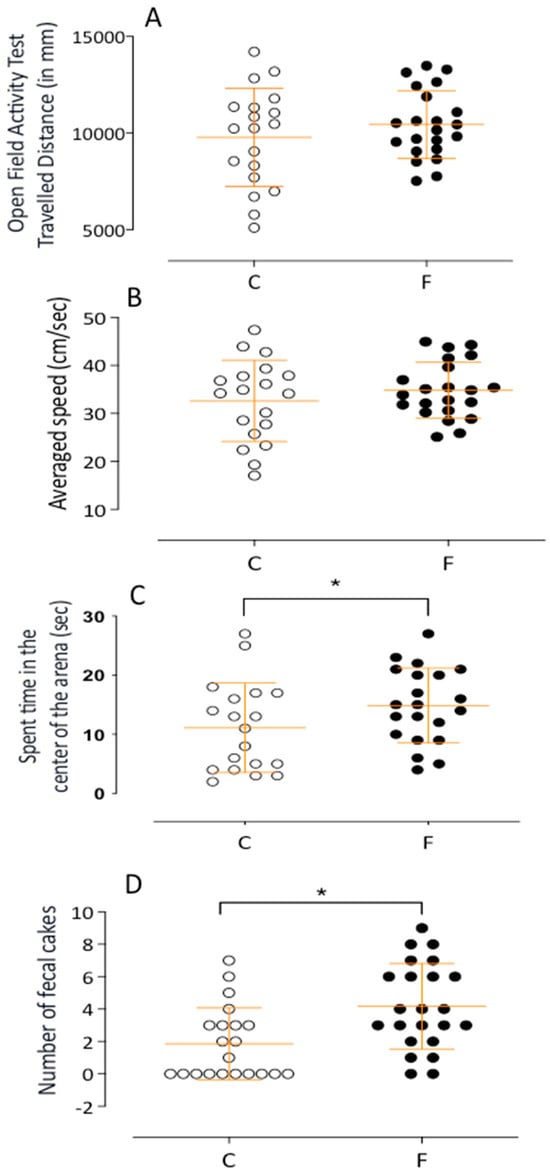The figure presents a dot plot representing results obtained by the activity monitor in the open field test and the level of activities. In the (A,B) panels, we demonstrate the traveled distance (in mm) and average speed (in cm/sec) during the open field test, and in the (C,D) panels, we show the time spent in the center of the arena and the fecal boluses as means ± SEM for male F and male C offspring. The most significant result is that the offspring from mothers treated with fluoxetine exhibited a significantly enhanced number of fecal pellets and spent time in the center of the arena. This finding underscores the impact of fluoxetine exposure on the offspring’s behavior. Comparisons involving only two means within or between groups were performed using Student’s t-test. Welch’s t-test was used to correct situations characterized by heteroscedasticity. When statistically significant differences were indicated between selected means, post hoc comparisons were performed using Bonferroni’s contrast test. The significance level was set at * p < 0.05.